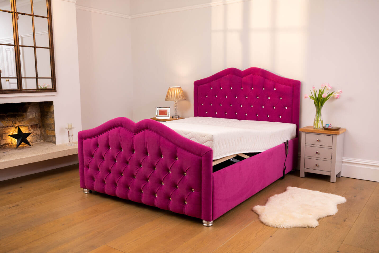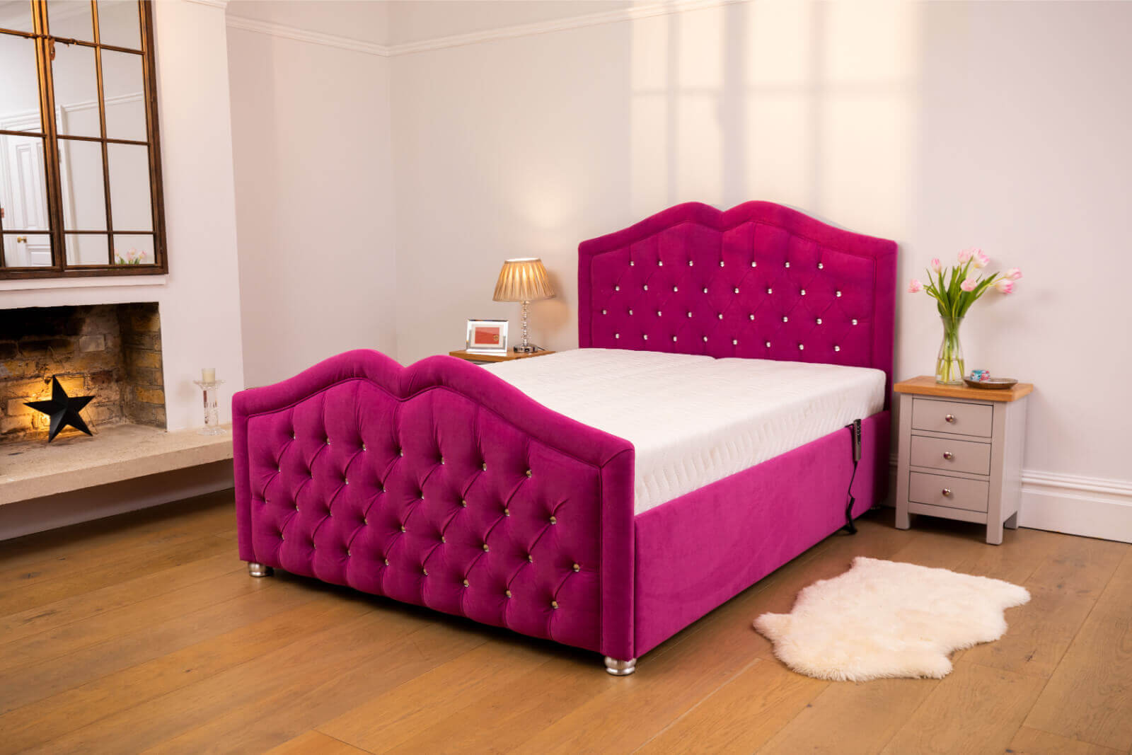 One of our newest additions to the range. The Flamingo offers sumptuous comfort and striking eye-catching detail with its diamante crystal-style buttoned headboard and footboard and shown here with round chrome feet. Featured in beautiful Notting Hill Plain Pink to really stand out from the crowd.